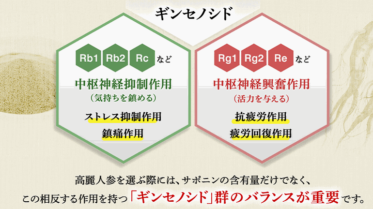 高麗人参にはサポニン成分「ギンセノシド」が多く含まれています。「ギンセノシド」には、中枢神経系に抑制的に働くRb群(Rb1、Rb2、Rcなど)と、反対に興奮的に働くRg群(Rg1、Rg2、Reなど)があり、外界からのストレス刺激に対する抵抗力や新陳代謝を高めると言われています。 |