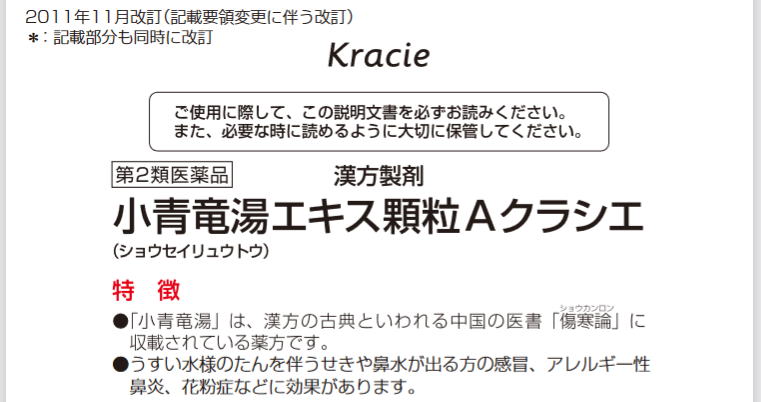 ●「小青竜湯」は、漢方の古典といわれる中国の医書『傷寒論[ショウカンロン]』に収載されている薬方です。 ●うすい水様のたんを伴うせきや鼻水が出る方の感冒、アレルギー性鼻炎、花粉症などに効果があります。