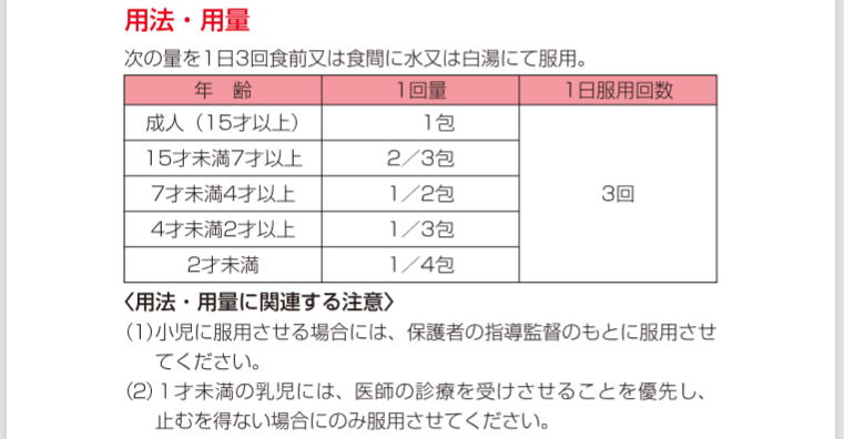 次の量を1日3回食前又は食間に水又は白湯にて服用。 成人(15才以上)・・・1回1包 15才未満7才以上・・・1回2/3包 7才未満4才以上・・・1回1/2包 4才未満2才以上・・・1回1/3包 2才未満・・・1回1/4包