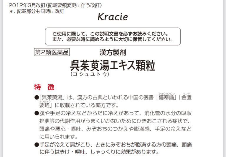 〔ゴシュユ1.5g、ショウキョウ0.5g、ニンジン1.0g、タイソウ2.0gより抽出。〕