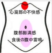 胃の消化不良、または飲食物の過剰摂取で、食べ物や水分が胃に停滞し、みぞおちのあたりがつかえて膨満が起こり、胸焼け胃痛などの症状が起こります。