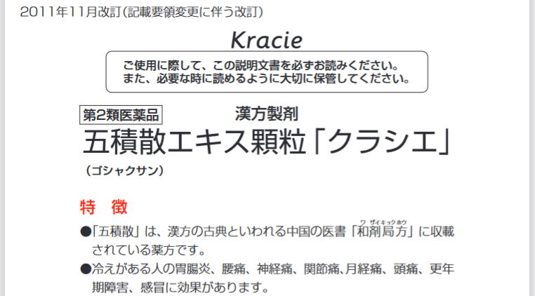 体力中等度又はやや虚弱で、冷えがあるものの次の諸症:胃腸炎、腰痛、神経痛、関節痛、月経痛、頭痛、更年期障害、感冒